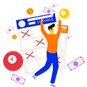Happy person surrounded by tickets, numbers and bank notes